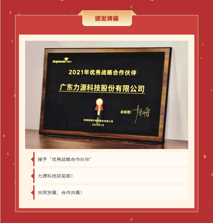 精誠合作,共創共贏丨力源科技榮獲珠海英搏爾“2021年度優秀戰略合作伙伴”